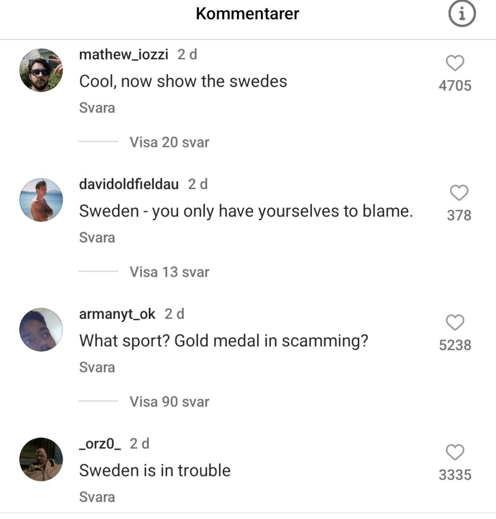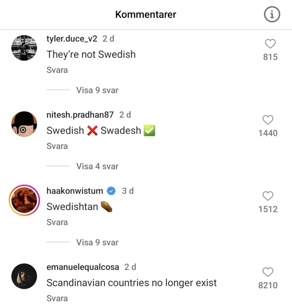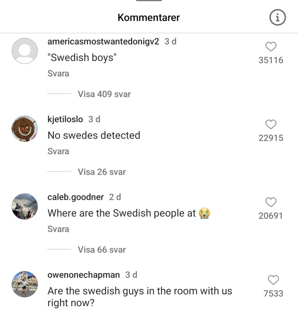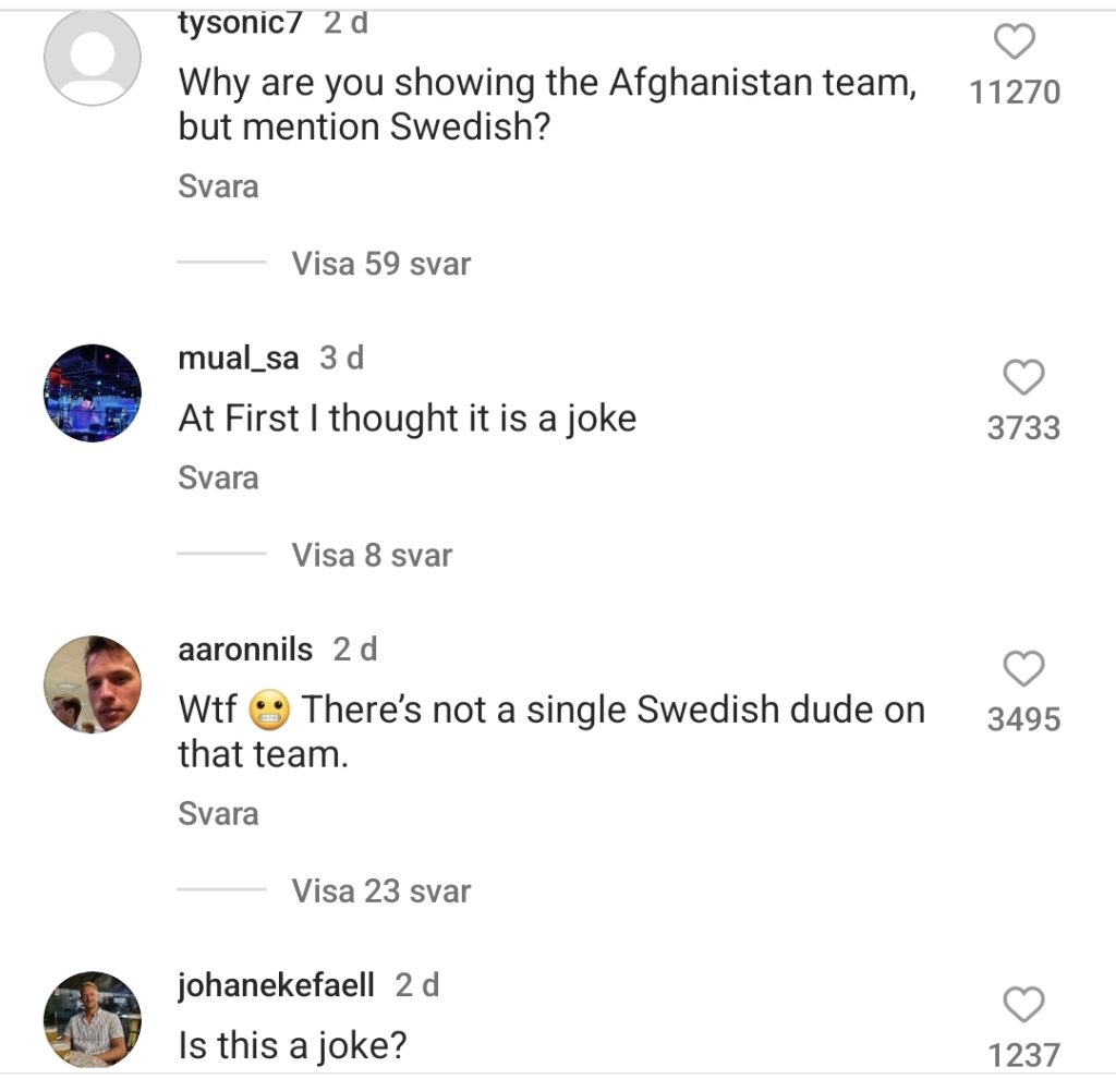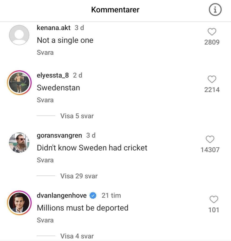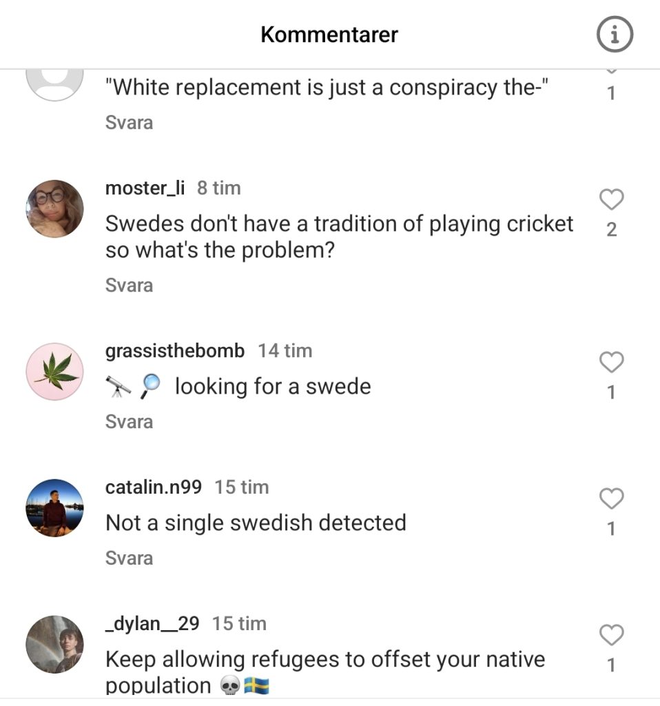 Ett av inläggen har över 7200 kommentarer och många frågar sig var svenskarna är. Kommentaren ”Swedish boys” som syftar på Danska cricketförbundets beskrivning av svenska landslaget har över 35 000 ”gilla”-markeringar.