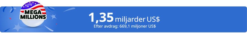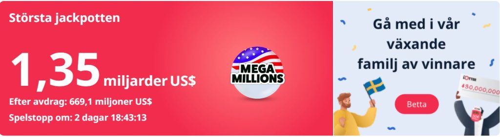 Amerikanska Mega Millions har just nu världens högsta jackpott – 1,35miljarder $ (669,1 miljoner $ efter avdrag) och motsvarar ca 14 000 000 000 kr(efter avdrag ca 6 952 000 000 kr). Trots att Mega Millions är ett amerikansktlotto och dragningen sker i USA kan svenskar vara med och spela omjackpotten genom att betta på dragningsresultatet hos theLotter Sverige.