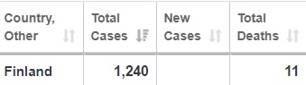 Finland har hittills 1240 bekräftade fall av coronaviruset (COVID-19) varav elva av dessa personer har avlidit. För att få kontroll på situationen har landet bland annat stängt gränsen och utför inre gränskontroller.