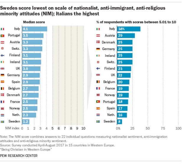 Enligt en ny undersökning från ansedda Pew Research Center, där man genom en ny skala kallad NIM (Nationalist, anti-Immigrant and anti-religious Minority) som kombinerar 22 frågor, är Sverige det mest toleranta landet i Västeuropa.