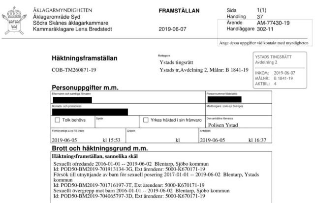 Samhällsnytt har tagit del av häktningsframställan av vilken det framgår att mannen blev anhållen den 5 juni på sannolika skäl – den högre misstankegraden – misstänkt för sexuellt ofredande, försök till utnyttjande av barn för sexuell posering och sexuellt övergrepp mot barn. Brotten ska ha begåtts från början av år 2016 och fram till juni i år.