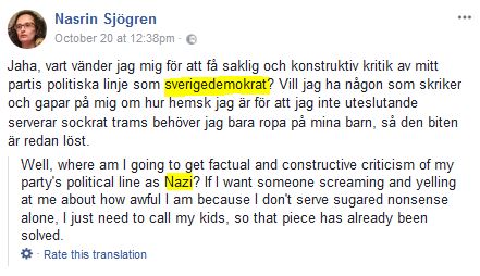 Ett exempel kan ses nedan i statusuppdateringar skrivna av den sverigedemokratiska profilen Nasrin Sjögren och den populära sidan Politikfakta, som fått många gilla-markeringar och delningar: