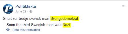 En av läsarna uppmärksammade Samhällsnytt om att ordet ”sverigedemokrat” översätts till engelska som ”nazi” i Facebooks eget automatiska översättningsverktyg. Vi kan konstatera att uppgiften stämmer och i flera statusuppdateringar översattes ordet just till ”nazi”.