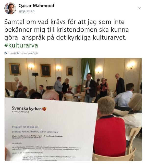I augusti förra året lägger Mahmood upp ett twitterinlägg från ett samtal han deltar i med Svenska kyrkan.
