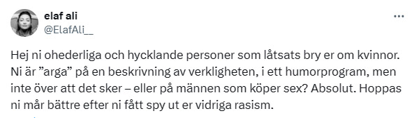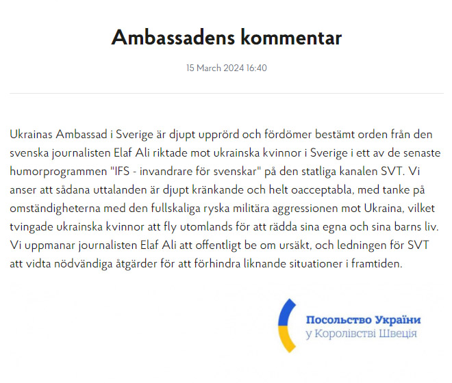 Den skattefinansierade tv-kanalens mångfaldssatsning ”Invandrare för svenskar” ledde förra veckan till protester från den ukrainska regeringen via dess ambassad i Sverige. Anledningen var att SVT-anställda Elaf Ali antytt att ukrainska flyktingkvinnor försörjer sig som prostituerade i Sverige.