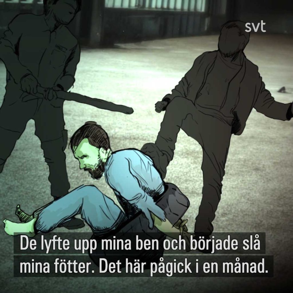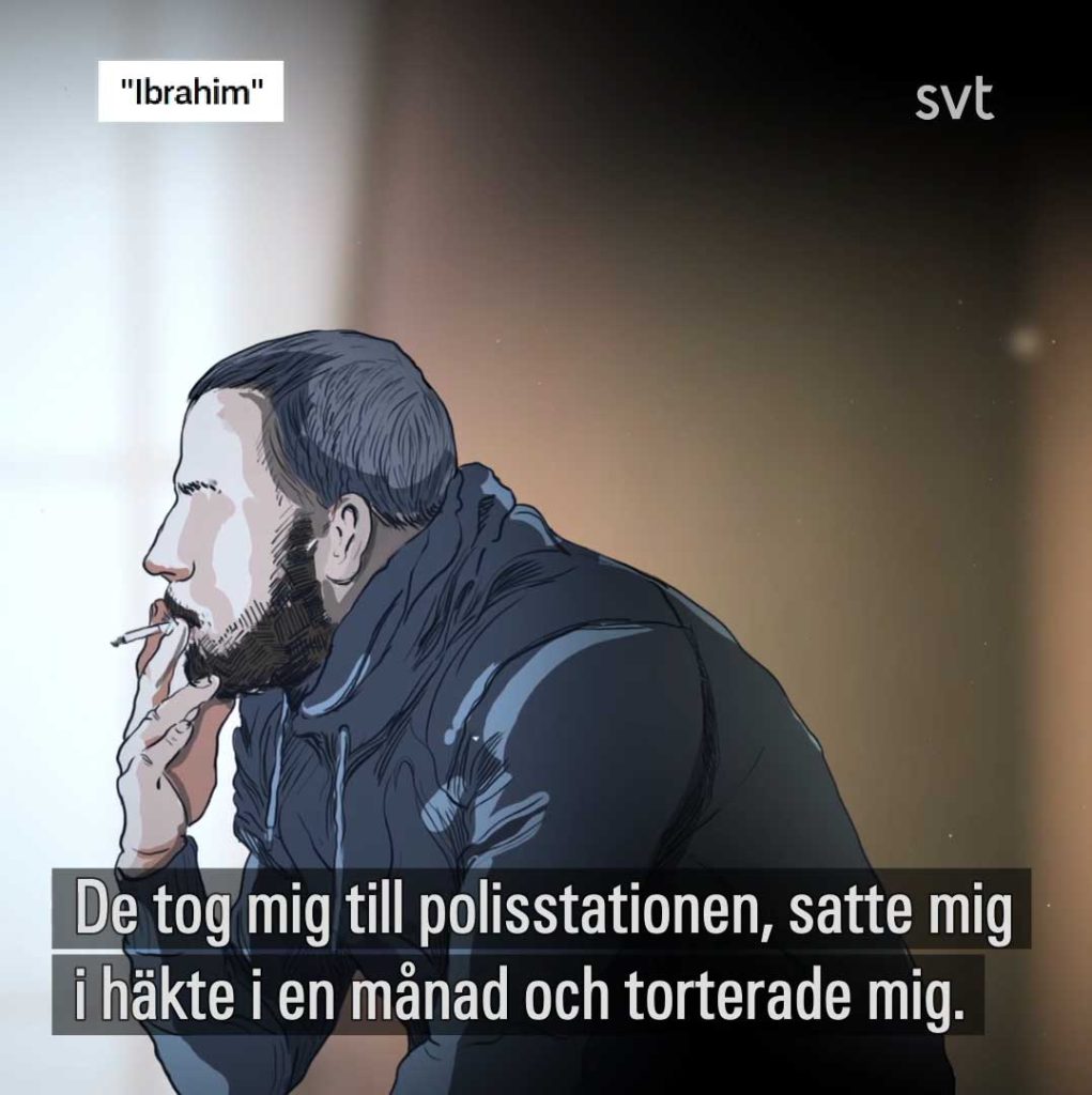 Ibrahim (som egentligen heter något annat men vars riktiga identitet SVT valt att dölja) hävdar att han efter återvändandet till Syrien som dömd knarkbrottsling i Sverige ”blev torterad” av syrisk polis. Han påstår bland annat att han ska ha placerats sittande i ett bildäck och fått ta emot flera slag.