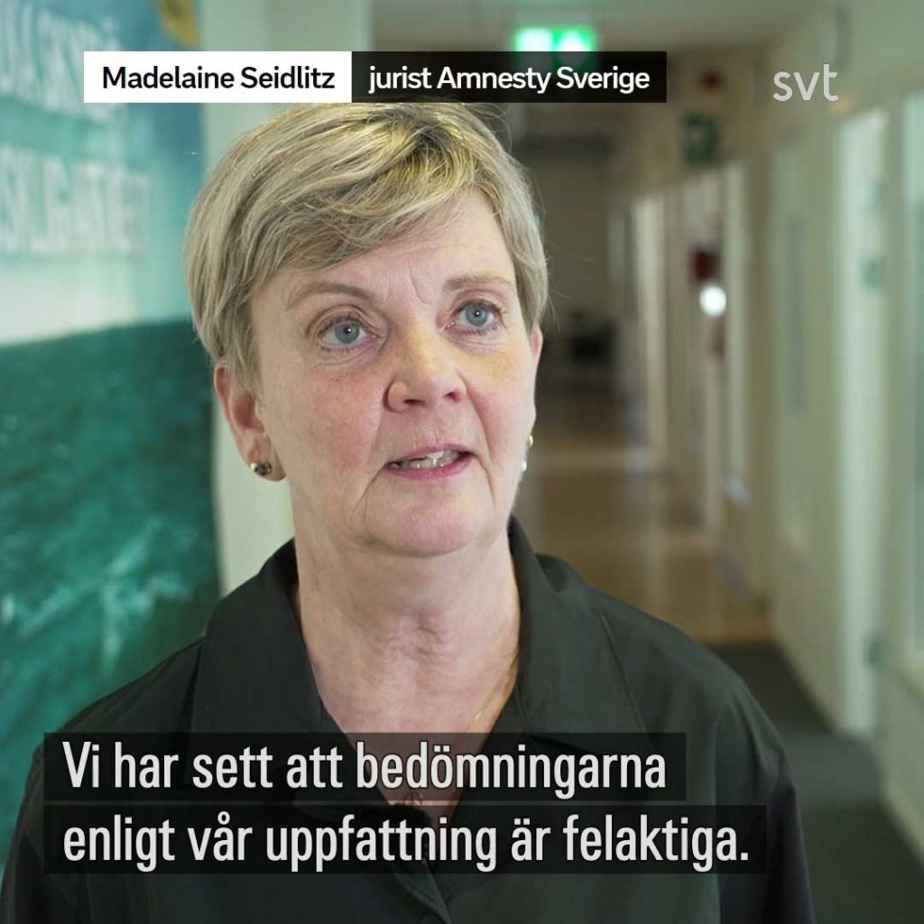 I ett tredje filmat inslag som ytterligare ska förstärka bilden av Ibrahim som ett offer intervjuas Madelaine Seidlitz som arbetar som jurist för den vänsteraktivistiska människorättsorganisationen Amnesty. Hon bekräftar att det är ”generellt olämpligt” att verkställa utvisningar till Syrien, alldeles oavsett vad slags person det gäller.