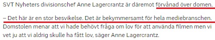 Anne Lagercrantz är chef för nyhetsdivisionen och hon säger sig vara ”förvånad över domen” som hon kallar ”en stor besvikelse”, rapporterade SVT.
