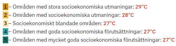 Vidare hävdar man att mediantemperaturen under juni, juli och augusti visar att den högsta mediantemperaturen i de flesta områdestyper är 27 grader medan den är högre i områden med så kallade socioekonomiska utmaningar.