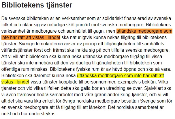 Det framgår tydligt av motionen att utgångspunkten är att de svenska biblioteken av naturliga skäl riktar sig primärt mot svenska medborgare. Vidare argumenterar Aronsson (SD) för att ”utländska medborgare som inte har rätt att vistas i landet ska kunna nekas tillgång till bibliotekens tjänster”.