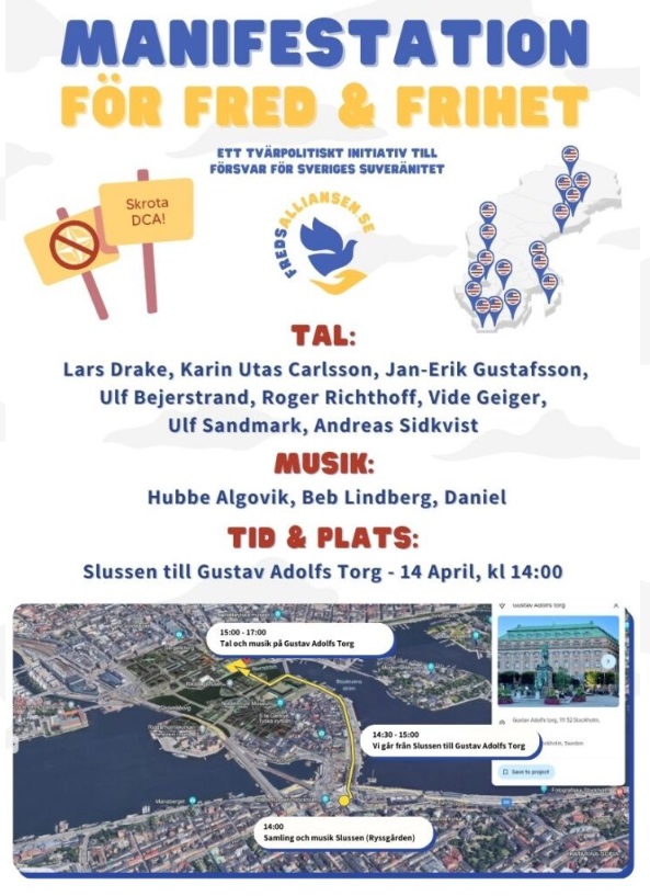 På söndag klockan 14.00 hålls ytterligare den demonstration i centrala Stockholm. Det är den tvärpolitiska Fredsalliansen som kallar till manifestation i centrala Stockholm för Sveriges suveränitet och mot det försvarssamarbetsavtal med USA som riksdagen röstar om den 8 maj.