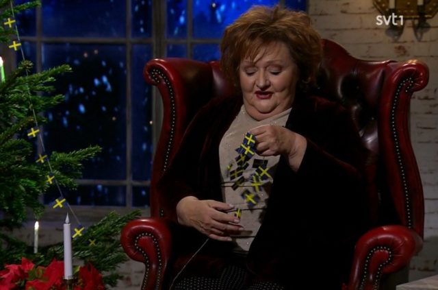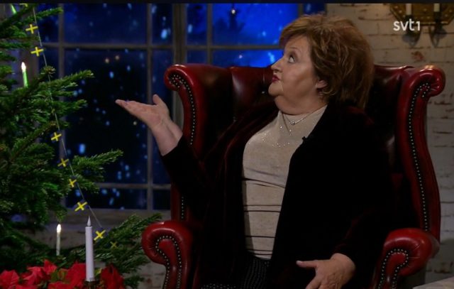 Mörck berättade om hennes barndom där julgranar dekorerades med svenska flaggor. Hon greppade sedan ointresserat julgranspyntet som SVT anordnat och frågade ”hur kul är detta liksom?”. Nedan följer skärmdumpar från scenen (hela klippet kan ses här):