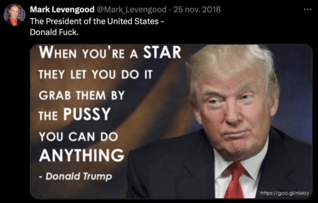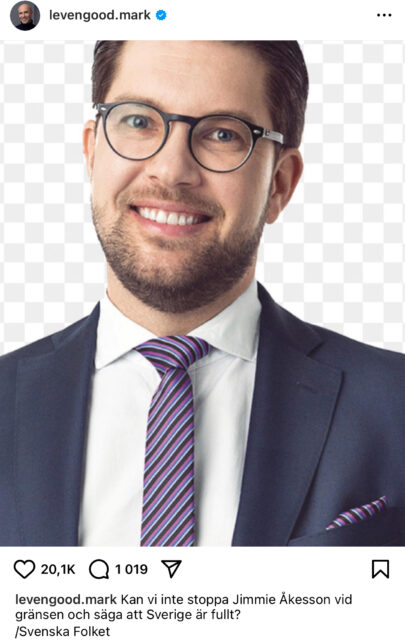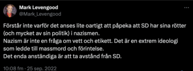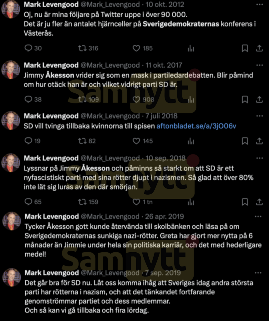 Samnytt har tittat närmare på Mark Levengoods konton i sociala medier och påträffat en lång rad hatiska inlägg mot Sverigedemokraterna som har publicerats under flera års tid. I de flesta inlägg har Levengood smetat nazism på partiet.
