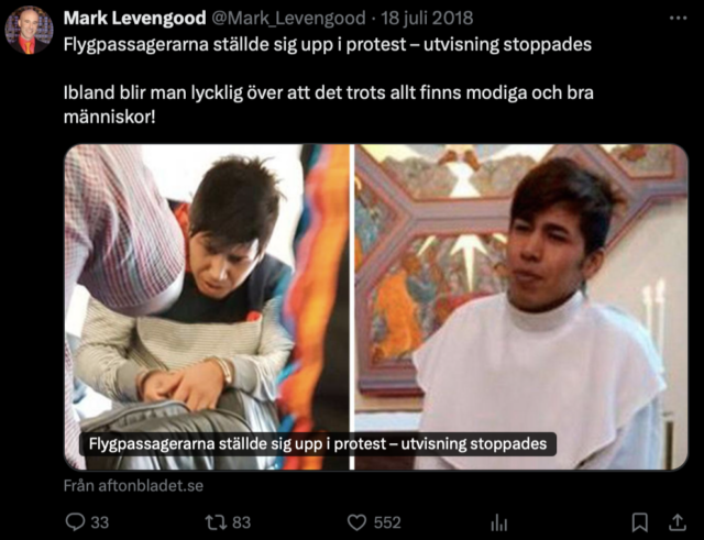 Mark Levengood är även en asylaktivist som i flera inlägg har förespråkat massinvandring till Sverige. I ett inlägg har författaren och programledaren även hyllat aktivister som stoppade en utvisning av en afghan.