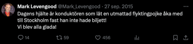 Under flyktingkaoset 2015 var ”dagens hjälte” för Levengood en tågkonduktör som lät en migrant resa i kollektivtrafiken utan biljett.