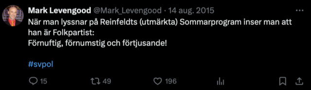 ”Oj, nu är mina följare på Twitter uppe i över 90 000. Det är ju fler än antalet hjärnceller på Sverigedemokraternas konferens i Västerås”.