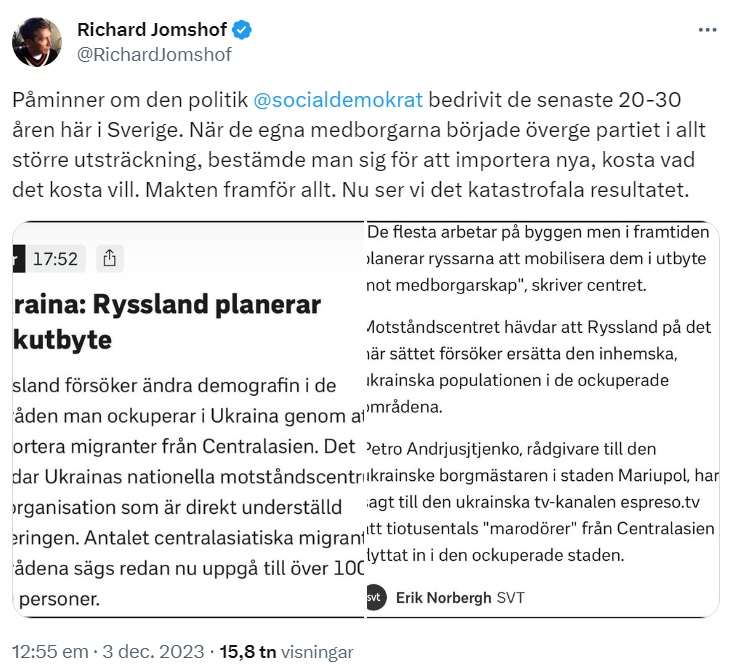 På sociala medier är det flera som har reagerat över SVT:s rapportering. En av dessa är SD-toppen tillika justitieutskottets ordförande Richard Jomshof. Han skriver att Rysslands planer påminner honom om den politik som Socialdemokraterna har bedrivit under de senaste 20-30 åren i Sverige.
