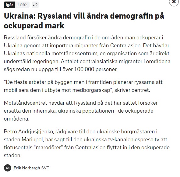 Under helgen har SVT larmat att Ryssland ”planerar folkutbyte” i Ukraina. Enligt SVT:s uppgifter försöker Ryssland ändra demografin i de områden som tagits över efter invasionen.