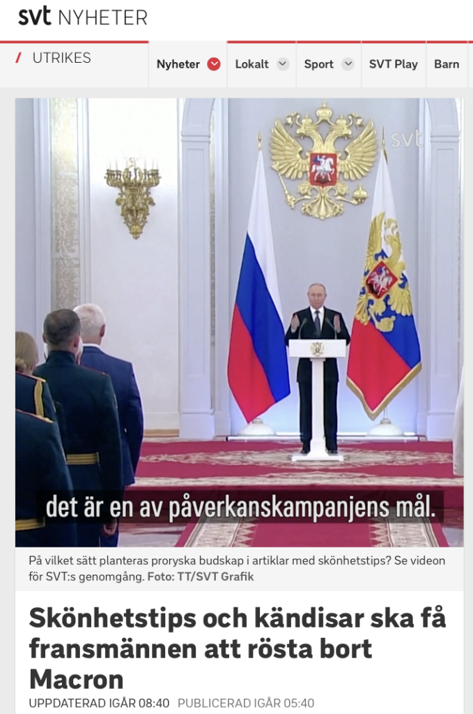 ”I artikeln presenteras Macron som en misslyckad politiker och ett nytt styre läggs fram som lösningen på landets alla problem, enligt den proryska desinformationen.”, skriver SVT.