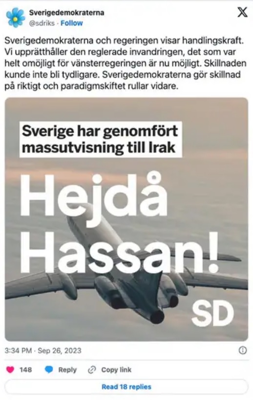 Det är vid halv fyra-tiden på tisdagseftermiddagen som Sverigedemokraterna lägger ut ett inlägg på Twitter, även känt som X, med anledning av att gränspolisen verkställt utvisningen av 26 irakier som vägrat lämna landet självmant.