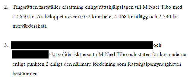 Örebro tingsrätt skriver i sin dom att pengarna ska betalas till Nael Tibo. Enligt en senare kompletterande rättelse ska pengarna istället betalas till hans advokat Ylva Hagstedt. Beslutet att poliserna ska betala pengar fattades av Johan Nordgren, rådman på Örebro tingsrätt.