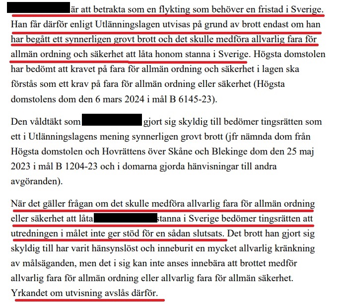 I domen står det att läsa att syriern är att betrakta som flykting och att han behöver en fristad i Sverige. Vidare anses inte våldtäkten vara tillräckligt för att hävda att syriern utgör en allvarlig fara för allmän ordning eller säkerhet i Sverige.