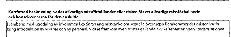 Samma månad kommer en anmälan in från Kiruna som nämner ”misstanke om sexuella övergrepp” samt ”brister i rutin kring introduktion av vikarier och ny personal” inom den kommunala hemtjänsten.