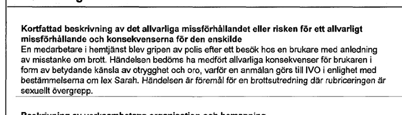 I november kommer det in en anmälan om ”ett allvarligt missförhållande” inom hemtjänsten i Ronneby. ”Anställd misstänkt för sexualbrott mot kund i dennes bostad” står att läsa i anmälan.