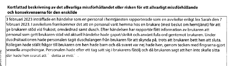’Efter ett duschtillfälle märks att ”brukaren har ett blåmärke under vänster öga”. Brukaren uppges efter händelsen vara rädd för den misshandelsanklagade hemtjänstmedarbetaren.