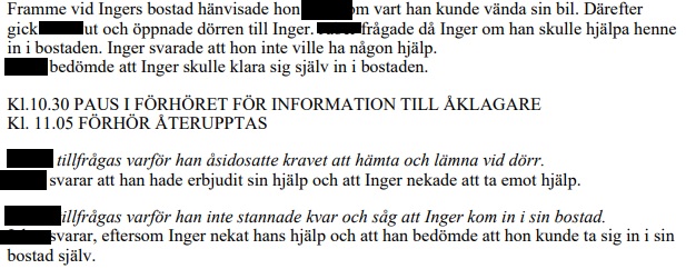 Hittade sin mor död i snön Ingers son ringde till sin mor klockan 18.20. Sonen uppger i polisförhör att han inte fick någon kontakt utan kom direkt till mobilsvar. Han försökte ringa ett flertal gånger under kvällen men utan resultatet. Då beslöt han sig för att åka från Umeå ned till Kramfors för att titta till sin mor.