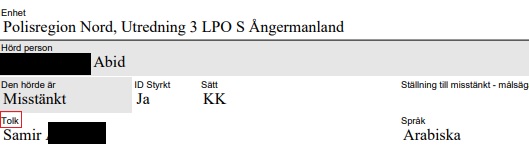 Förhör med taxichauffören I polisförhör behöver Abid, som kommer från Irak, arabisk tolk för att kommunicera. Det framgår av protokollet att tolken som förmedlade informationen vidare till polisen är Abids vän Samir.