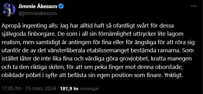 Smutskastningen av SD i DN intervju har inte passerat partiledaren Jimmie Åkesson obemärkt. Han nämner i en kommentar på X inte Alice explicit utan riktar generell kritik mot det han kallar ”ynkliga” och ”självgoda finborgare”.