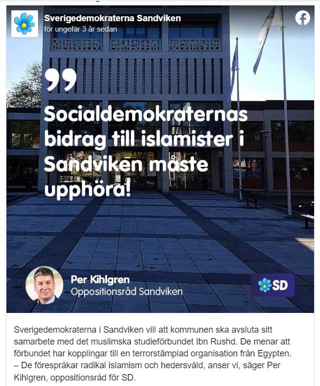 Studieförbundet Ibn Rushd har varit en het politisk fråga de senaste åren, och dess ansökningar om bidrag har avslagits tre år i följd tack vare Sverigedemokraterna. Partiet har vid minst sju olika tillfällen motionerat om att stoppa samarbeten och bidrag till den terrorkopplade organisationen, men har inte lyckats denna gång.