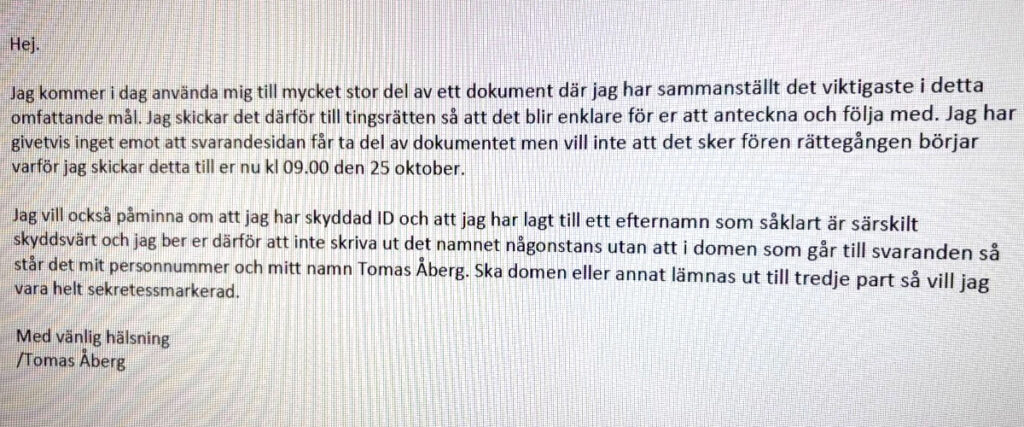 ”Jag kommer i dag använda mig till mycket stor del av ett dokument där jag har sammanställt det viktigaste i detta omfattande mål. Jag skickar det därför till tingsrätten så att det blir enklare för er att anteckna och följa med. Jag har givetvis inget emot att svarandesidan får ta del av dokumentet men vill inte att det sker fören [sic] rättegången börjar varför jag skickar detta till er nu kl 09.00 den 25 oktober”, kräver Tomas Åberg i ett mejl till domstolen.