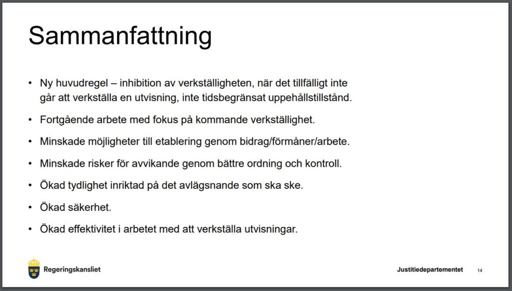 Det var migrationsminister Johan Forssell (M) som tog emot promemorian Inhibition av verkställigheten – en ny ordning för vissa utlänningar vid tillfälliga verkställighetshinder där det lämnas förslag som syftar till att effektivisera återvändandearbetet och öka kontrollen över utlänningar som utgör säkerhetshot eller har gjort sig skyldiga till allvarliga brott.