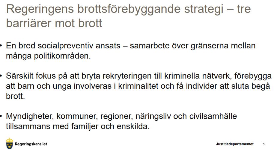På en pressträff på torsdagen presenterade bland andra justitieminister Gunnar Strömmer (M) regeringens nya nationella strategi för brottsförebyggande. Denna syftar till att bekämpa de mångkulturella gängens allt hårdare grepp om, och påverkan på, samhället.