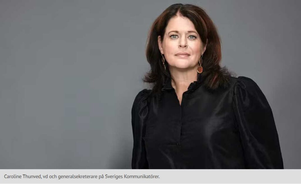 Caroline Thunved – som titulerar sig såväl vd som generalsekreterare på Sveriges kommunikatörer – menar i en kommentar till regeringens beslut att man nu rycker undan ”en av demokratins grundpelare” och misstänkliggör landets alla kommunikatörer som enligt henne ”gör ett fantastiskt jobb”.
