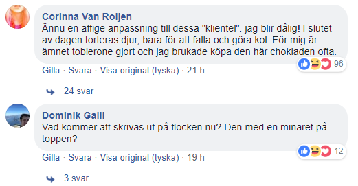 De två nedanstående inläggen är översatta automatiskt från tyska till svenska genom Facebook. Den sista kommentaren undrar om chokladpackningarna snart kommer att ha en minaret på toppen av det nuvarande alpberget.