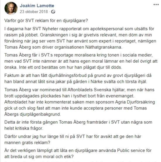 Det första inlägget är från oktober 2018 då Lamotte kritiserar sin tidigare arbetsgivare Sveriges television för att ha anlitat Åberg som ”expert” på rasism. ”Varför gör SVT reklam för en djurplågare?” undrar Lamotte.