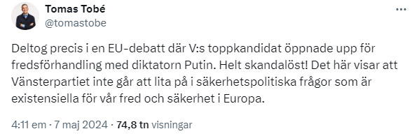 Det är ”helt skandalöst” att vilja förhandla om fred i Ukraina med Ryssland. Det anser den moderata EU-parlamentarikern Tomas Tobé.