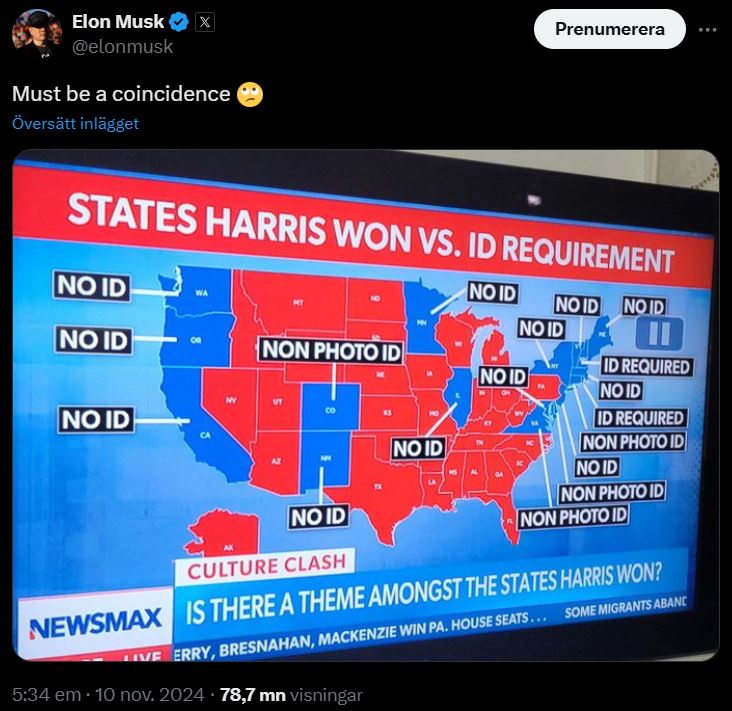 I vissa delstater krävs inte id-handlingar för att rösta, något som förenklar fusk och är ett ämne som debatterats flitigt inför valet. Valsiffrorna visar också på ett klart samband mellan delstater där id inte krävs och flest röster för Kamala Harris: