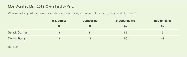 Donald Trump och Barack Obama delar år 2019 som mest beundrad man av amerikanarna. Det är Obamas tolfte gång i förstaplatsen och Trumps första. Samtidigt är Michelle Obama den mest beundrade kvinnan för andra året i rad.