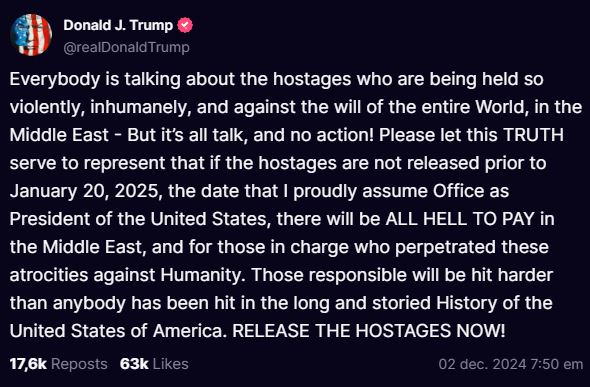 I inlägget skriver Trump att alla pratar om gisslan i Mellanöstern men ingen gör något, och ifall de inte släpps innan han svärs in som president den 20 januari nästa år kommer helvetet bryta löst för de inblandade.