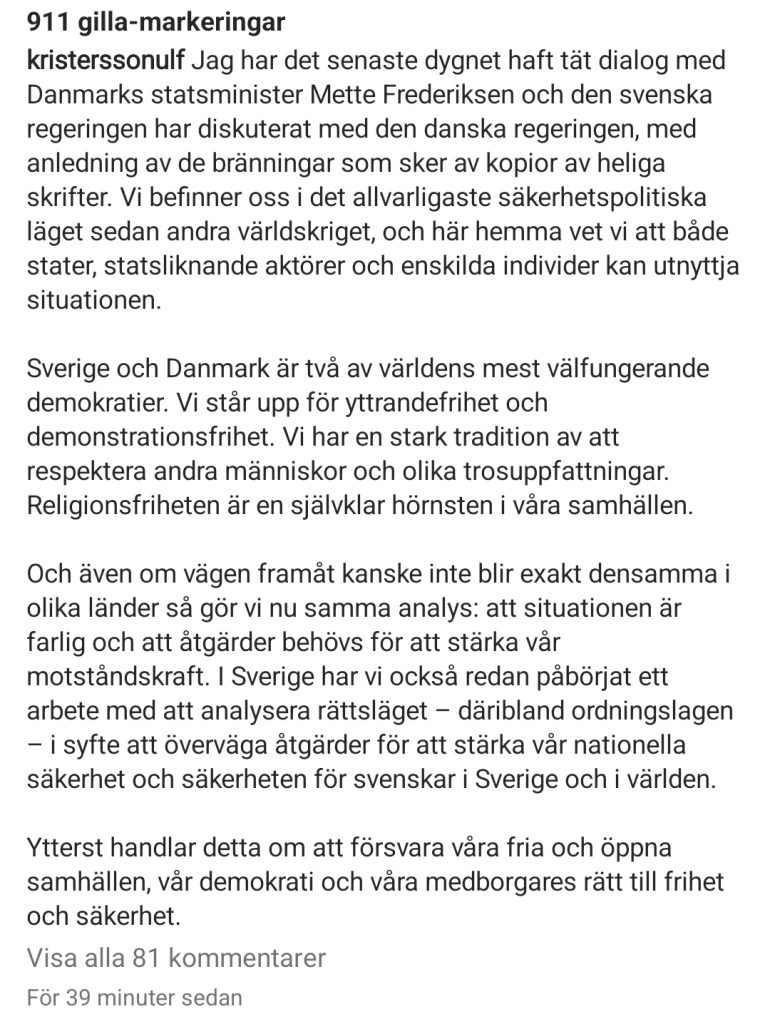 Statsminister Ulf Kristersson (M) har publicerat ett Instagraminlägg i vilket han framför att Sverige befinner sig i det allvarligaste säkerhetspolitiska läget sedan andra världskriget.