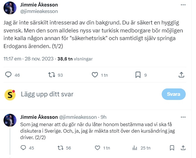 SD-ledaren skriver att en person som alldeles nyss var turkisk medborgare inte ska kalla någon annan för ”säkerhetsrisk” och samtidigt springa Erdogans ärenden.