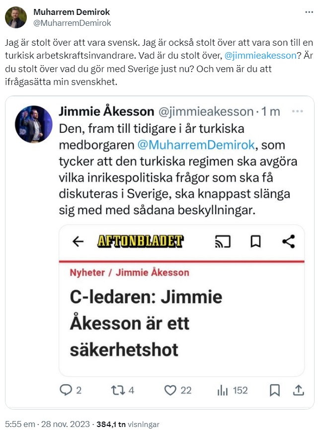Demirok känner sig kränkt över att Åkesson uppmärksammar att han fram till nyligen var turkisk medborgare. C-ledaren skriver att han är ”stolt över att vara svensk” och frågar Åkesson vem han är att ifrågasätta hans svenskhet.