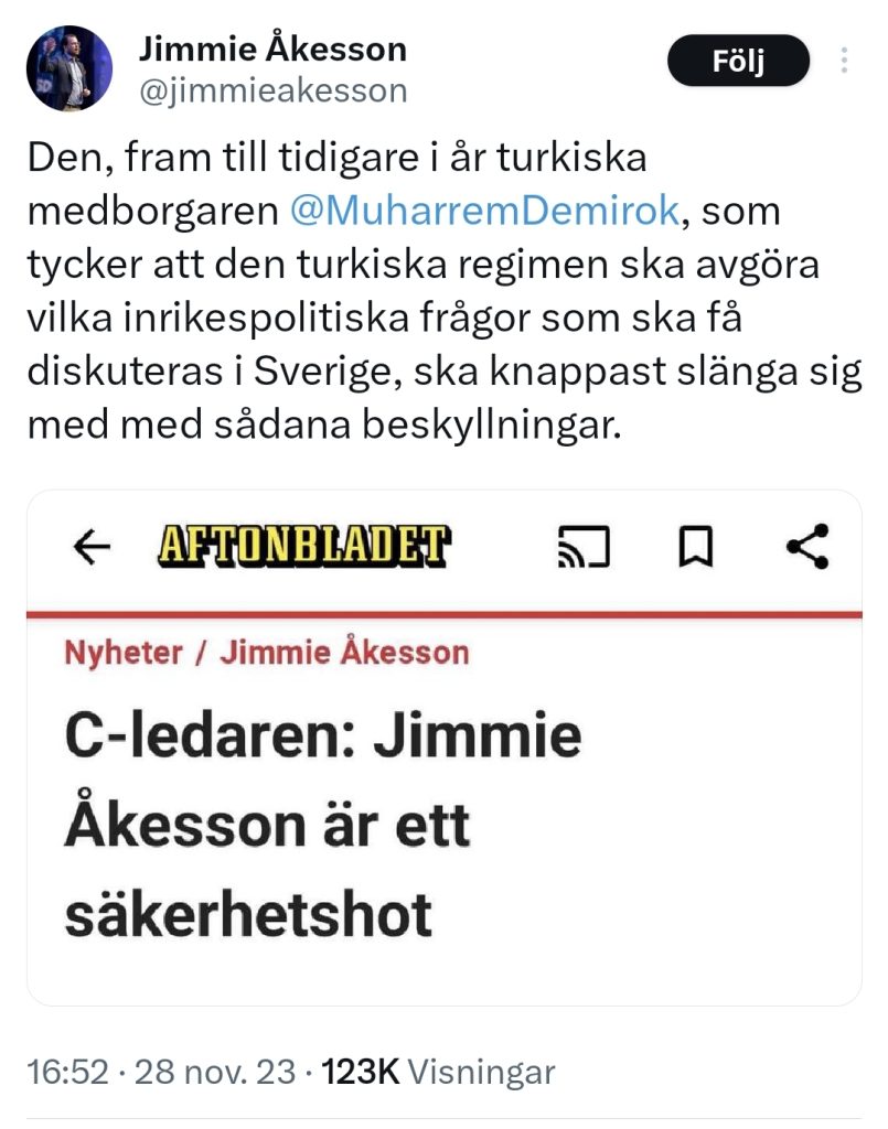 Muharrem Demirok som är född i Sverige, men sedan födseln turkisk medborgare, blev inte svensk medborgare förrän han var 21 år gammal. Åkesson lyfte det faktumet i ett svar på C-ledarens beskyllningar om att han skulle utgöra ett säkerhetshot.