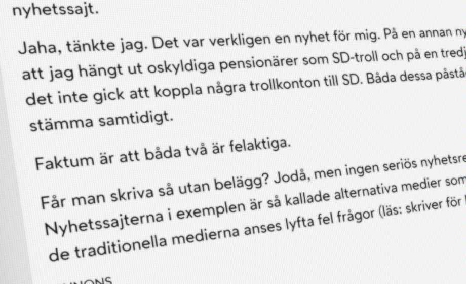 ”På en annan nyhetssida fick jag veta att jag hängt ut oskyldiga pensionärer som SD-troll och på en tredje att jag ’erkänt’ att det inte gick att koppla några trollkonton till SD. Båda dessa påståenden kan givetvis inte stämma samtidigt”, skriver han.