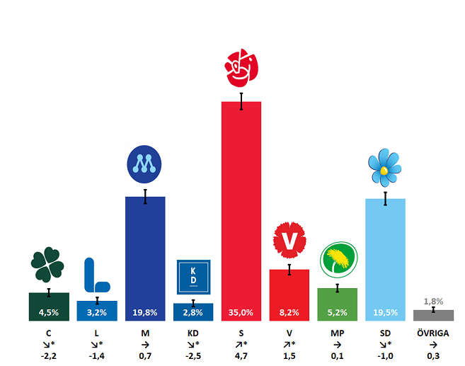 Med 35 procent blir Socialdemokraterna som vanligt största parti med god marginal. Andraplatsen blir en knapp seger för Moderaterna med Sverigedemokraterna hack i häl, partierna får 19,8 respektive 19,5 procent vardera.