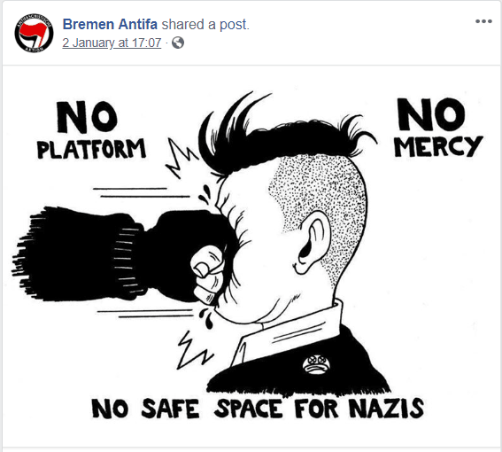 Uppmuntrar våld mot AfD I början av året publicerade Antifascistisk aktions lokalavdelning i Bremen material som uppmuntrade till våld. Ett par dagar senare attackerades AfD-politikern Frank Magnitz brutalt i Bremen.